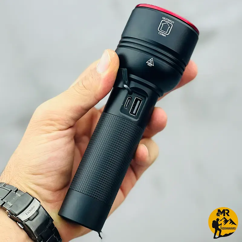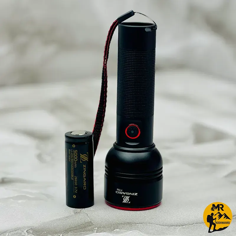 چراغ قوه زینگارو مدل F786 با باتری 5000 میلیآمپر، روشنایی 3000 لومن، برد 700 متر، نور مهتابی و قابلیت زوم؛ مناسب کمپینگ، کوهنوردی، پیادهروی شبانه و استفادههای روزمره در شرایط مختلف