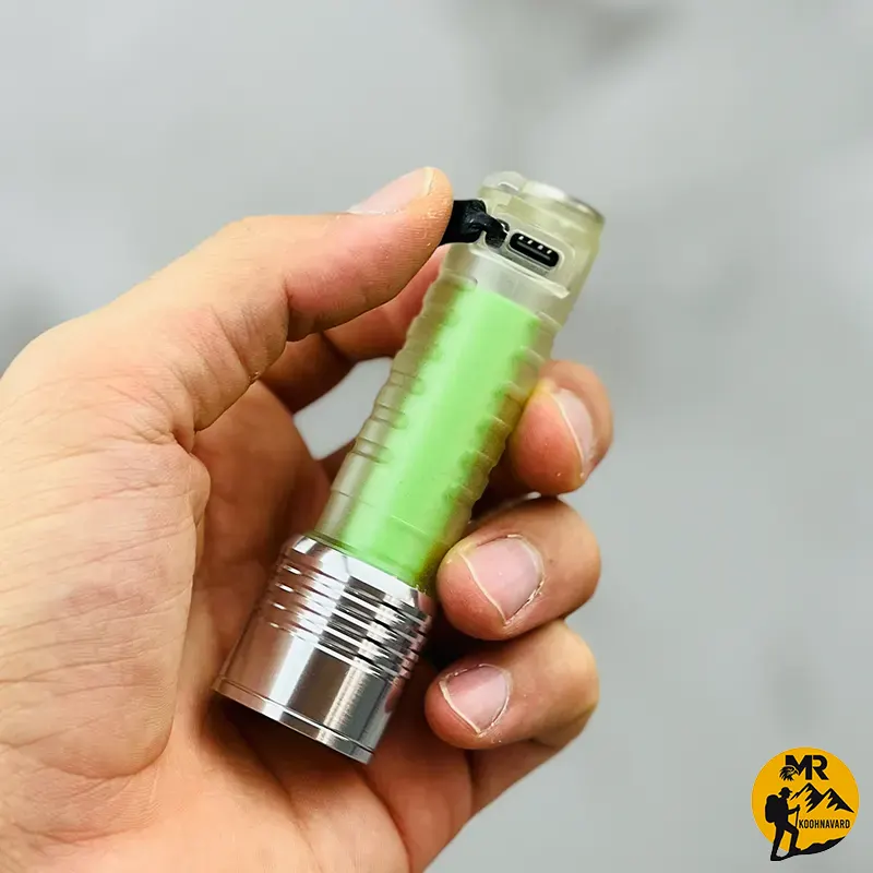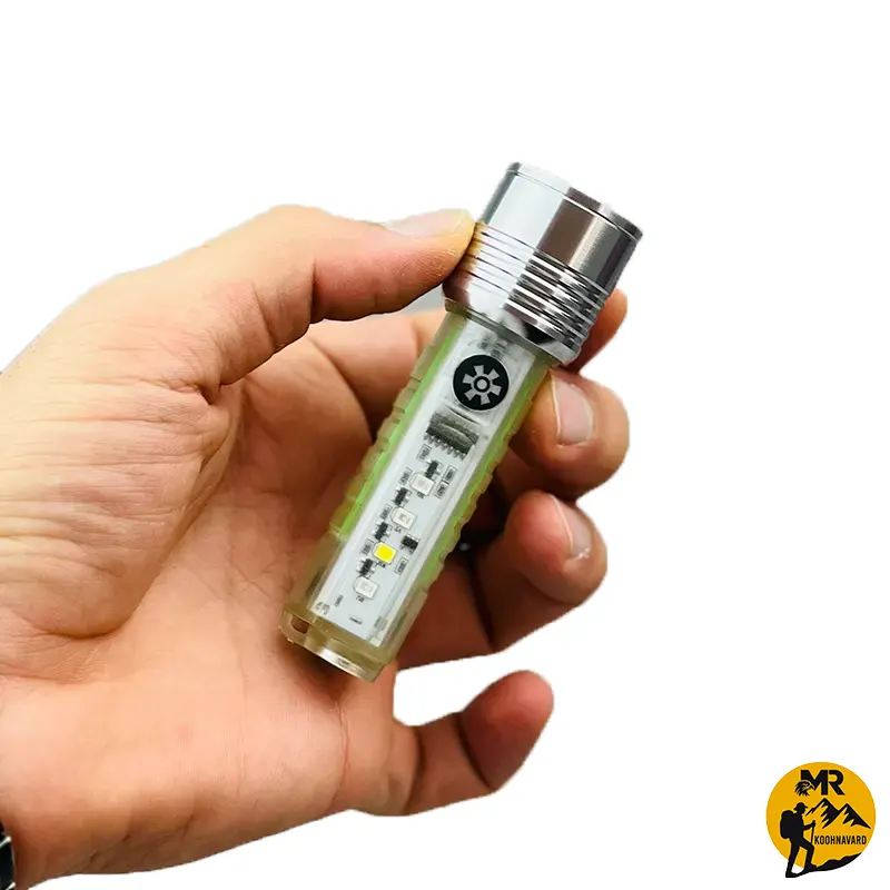 چراغ قوه چندمنظوره و زومدار مدل 520D با نور سفید، قرمز و آبی، برد 80 متر، باتری 14500 داخلی، شارژ USB-C، دوام تا 1.5 ساعت، سبکوزن و مناسب کارهای روزمره، تعمیرات و کمپینگ