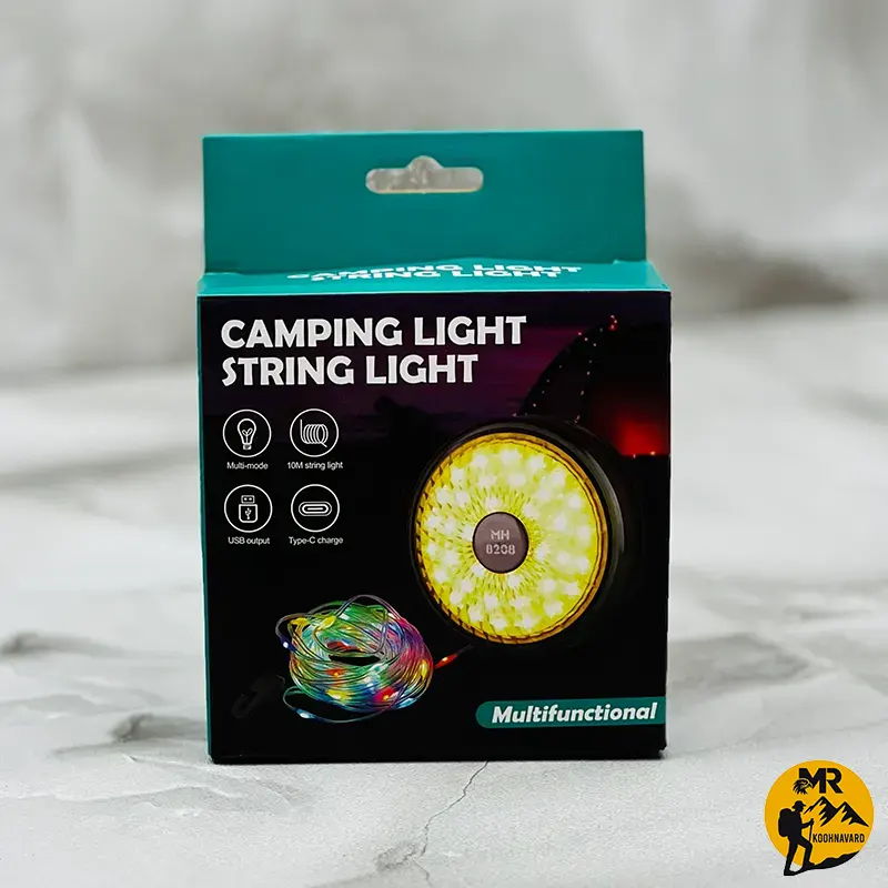 چراغ ریسه کمپینگ 10 متری MH-8208 اورجینال با نور LED، باتری 4800 میلیآمپر، نوردهی حدود 5 ساعت، شارژ USB Type-C، قابلیت آویز و سبک برای کمپینگ و فضای باز