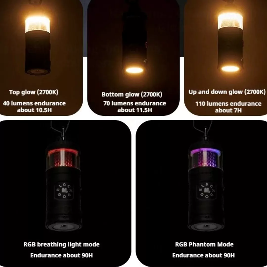 | حالتهای نور RGB (فانتوم و نور تنفس) | چراغ مجهز به نور RGB در حالت فانتوم و تنفسی است که میتواند تا 90 ساعت روشن بماند. این نورپردازی رنگی، فضایی متفاوت و جذاب در کمپینگ، مهمانی یا داخل چادر ایجاد میکند و تجربهای لذتبخش و متفاوت برای شبهای سفر به همراه میآورد |