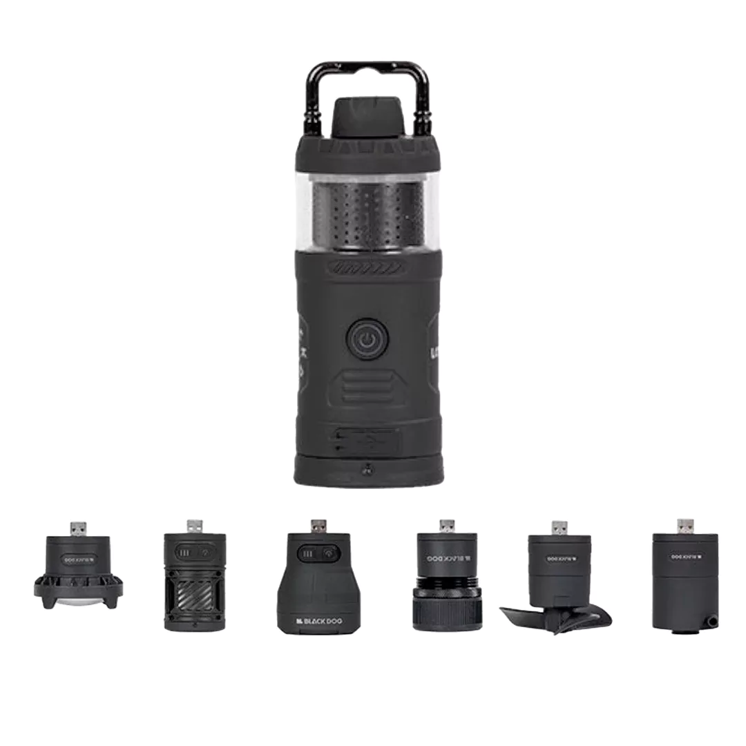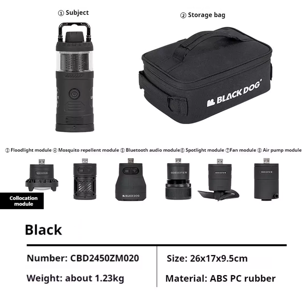 چراغ ماژولار چندکاره بلک داگ مدل CBD2450ZM020 با طراحی 7 کاره شامل چراغ اصلی، نورافکن، فن، اسپیکر بلوتوث، پمپ باد و دافع حشرات. بدنه مقاوم، باتری 5000mAh، شارژ سریع Type-C و مقاومت IPX4؛ ایدهآل برای سفر و کمپینگ