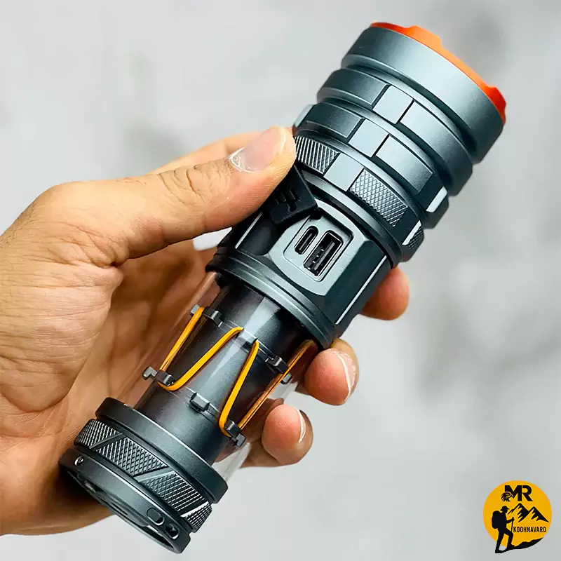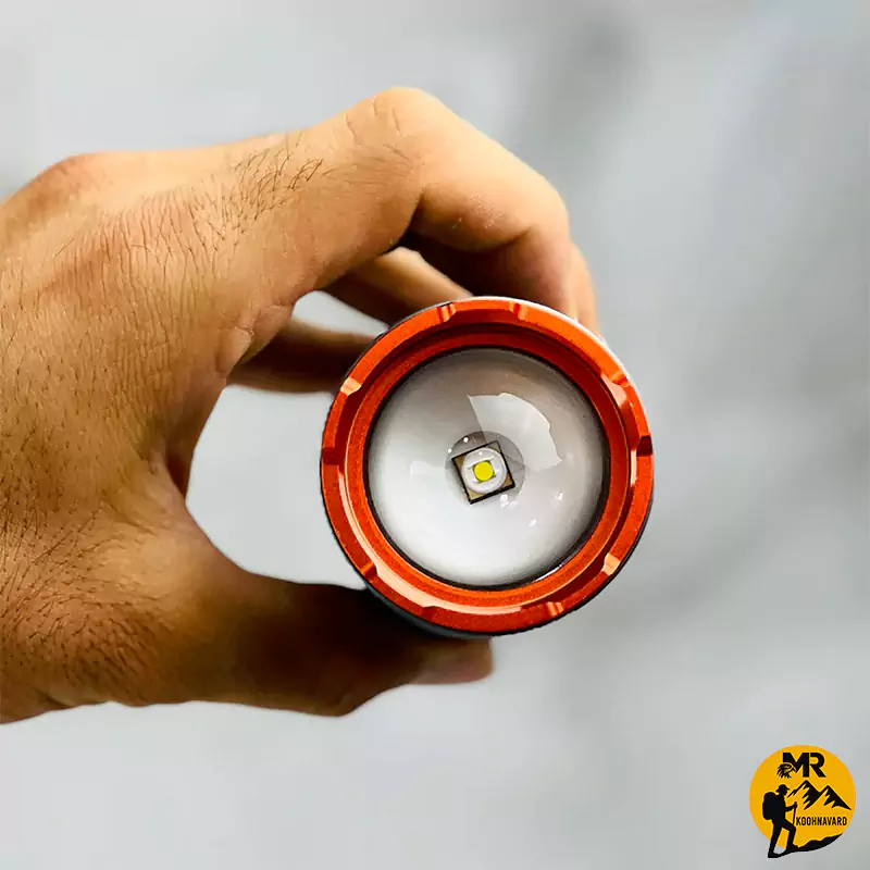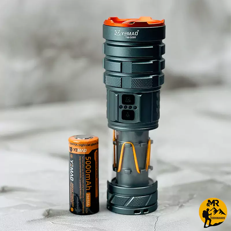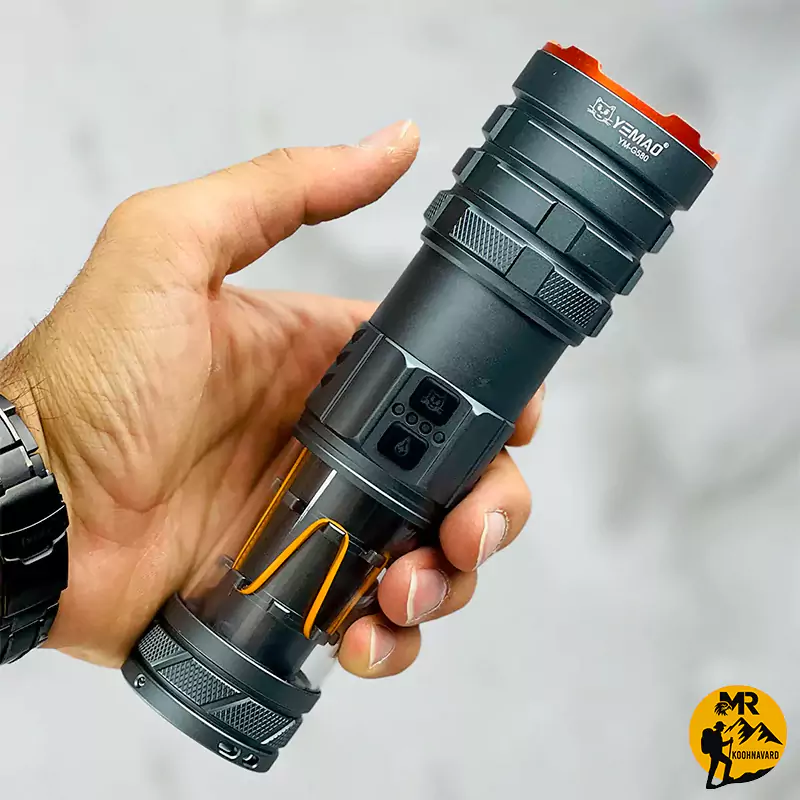 چراغ قوه یامو مدل YEMAO YM-G580 با قدرت روشنایی 6000 لومن، برد نور 600 متر، باتری 5000 میلیآمپری قابل شارژ، دارای قابلیت زوم و نور سفید، مناسب برای کمپینگ، کوهنوردی و استفاده در شرایط اضطراری