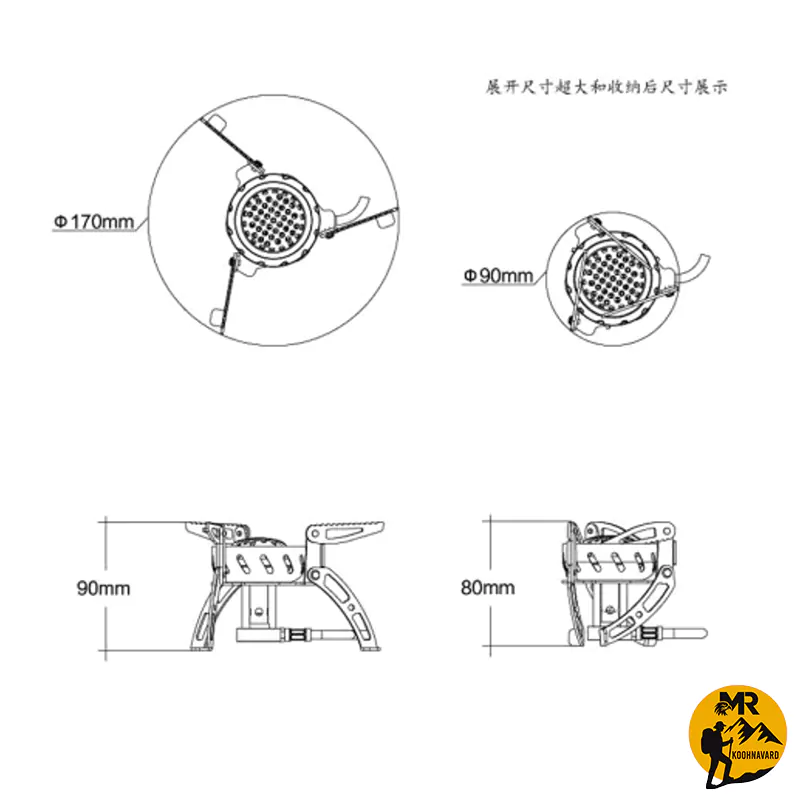 | ابعاد در حالت باز | (170×90 میلیمتر), این ابعاد استاندارد موجب پایداری عالی سرشعله میشود و امکان استفاده از ظروف متوسط تا بزرگ را بدون نگرانی از افتادن یا لرزش فراهم میسازد. طراحی متوازن پایهها نیز ثبات بیشتری به سرشعله داده و استفاده در زمینهای ناهموار را آسانتر میکند |
