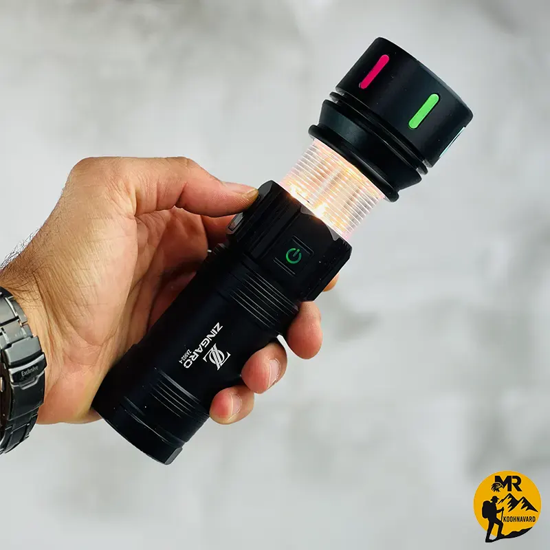 چراغ قوه فانوس دار زینگارو مدل ZA902-4 با ظرفیت باتری 9800 میلیآمپرساعت، مدت زمان شارژدهی 3 ساعت، قابلیت زوم، نور سفید و فانوسی با برد 600 متر و قدرت روشنایی 2500 لومن، مناسب برای کمپینگ، سفر و استفاده در فضای باز