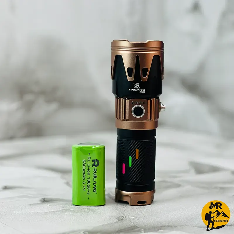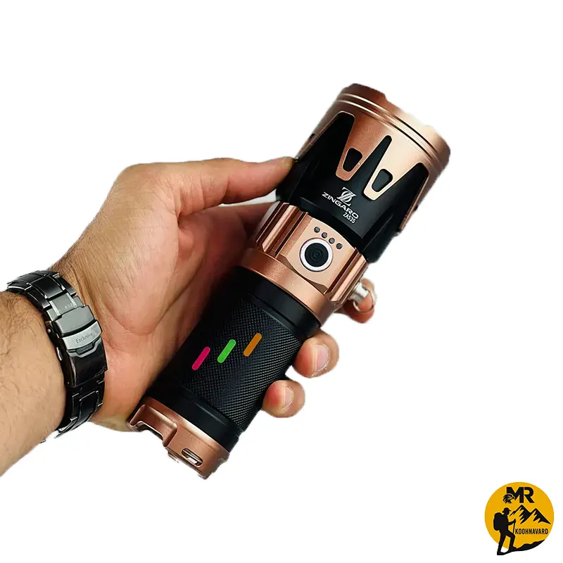 چراغ قوه زینگارو مدل ZA535 با ظرفیت باتری 9800 میلیآمپر، مدت زمان شارژدهی 3 تا 4 ساعت، قابلیت زوم، نور سفید با برد 700 متر و قدرت روشنایی 3500 لومن، مناسب برای استفاده در فضای باز و فعالیتهای روزمره