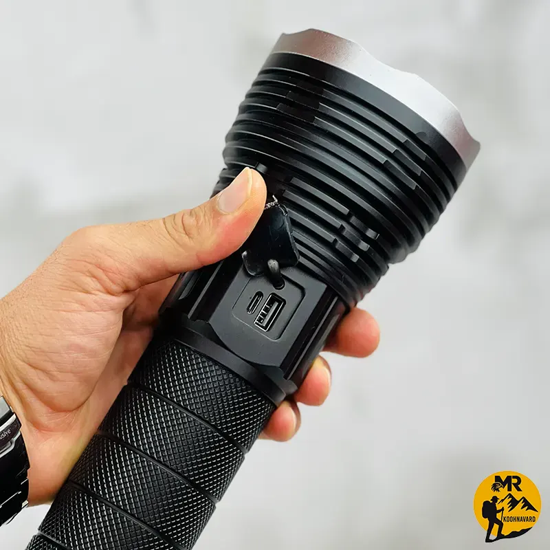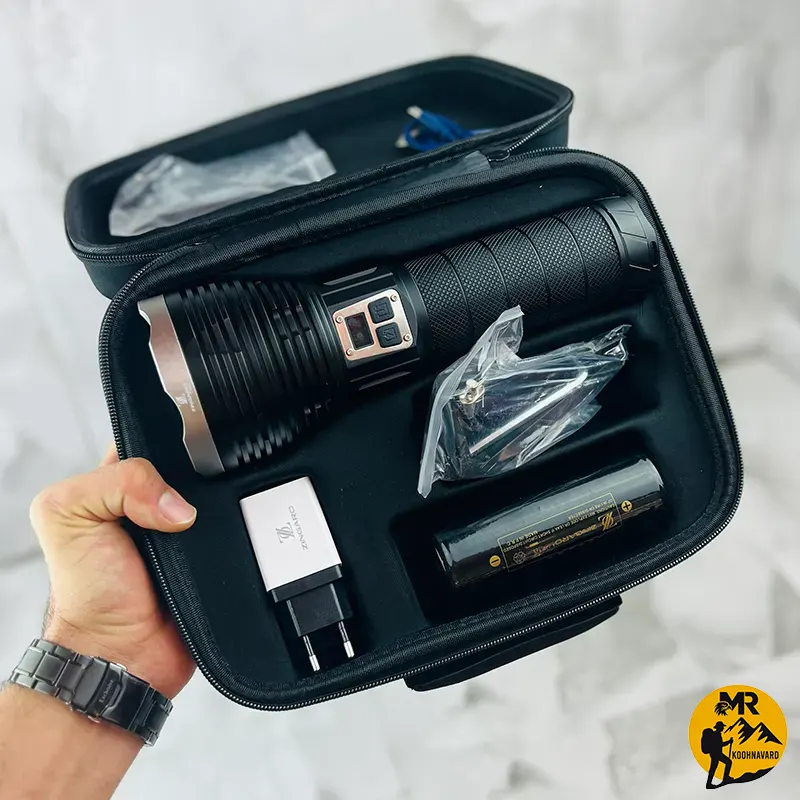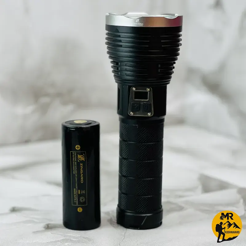 چراغ قوه زینگارو مدل T300 با قدرت روشنایی 4500 لومن، برد نور 1000 متر، باتری 4100 میلیآمپر، ضد آب و دارای نور سفید، مناسب برای نگهبانی، کمپینگ، شکار و استفاده در فضای باز